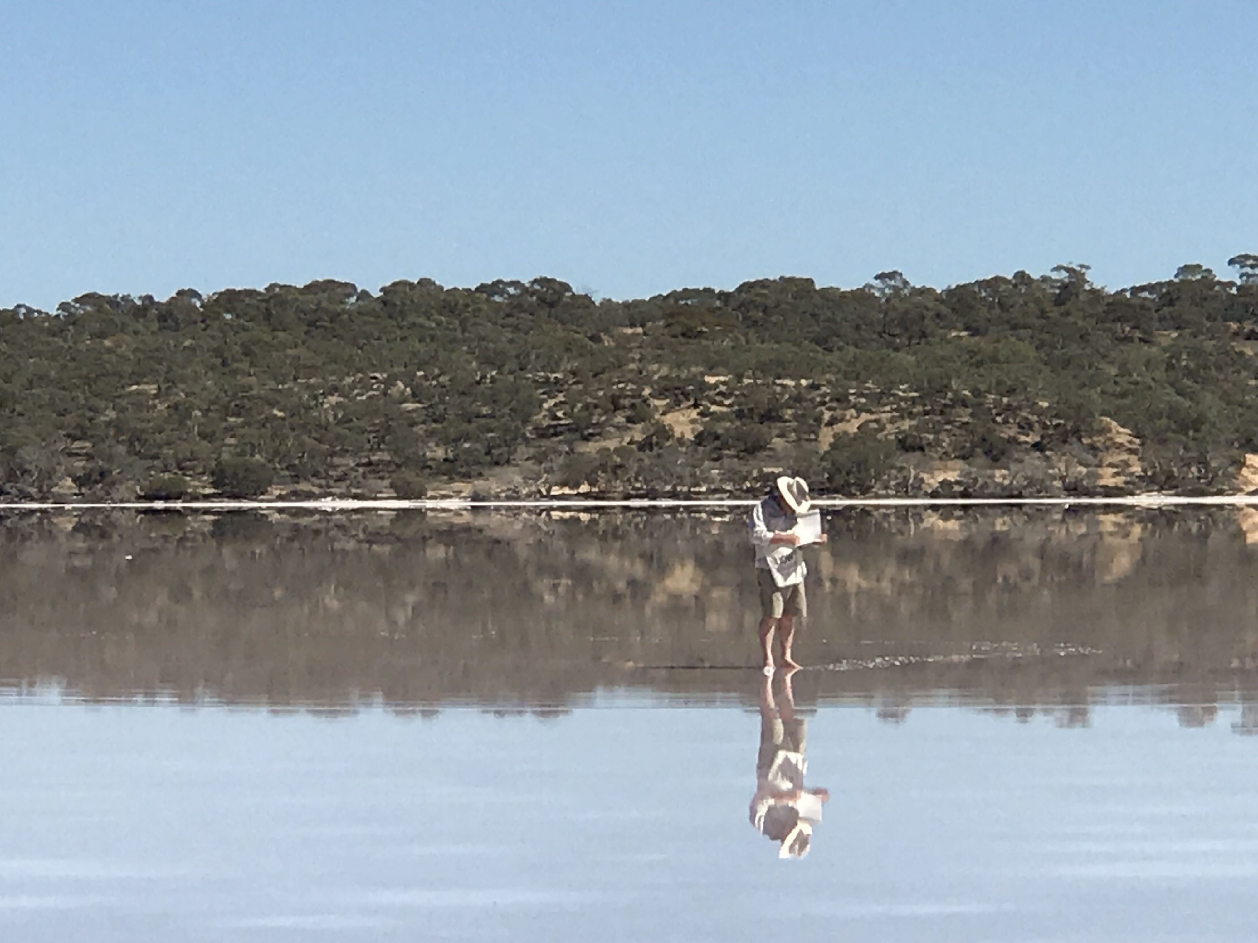On my way from Sydney to Adelaide, going along a back route, I often stop by the Pink Salt Lakes in Murray Sunset National Park to walk about and draw. This place is Aboriginal land that includes the traditional Country of the Latji Latji, Ngintait and Nyeri Nyeri Peoples. At one time there were salt mines here, horses had to wear special hoof coverings because the salt would trouble their feet. However, when I am there drawing, it is a much more ancient culture that seems to hum in the play between colour and light.